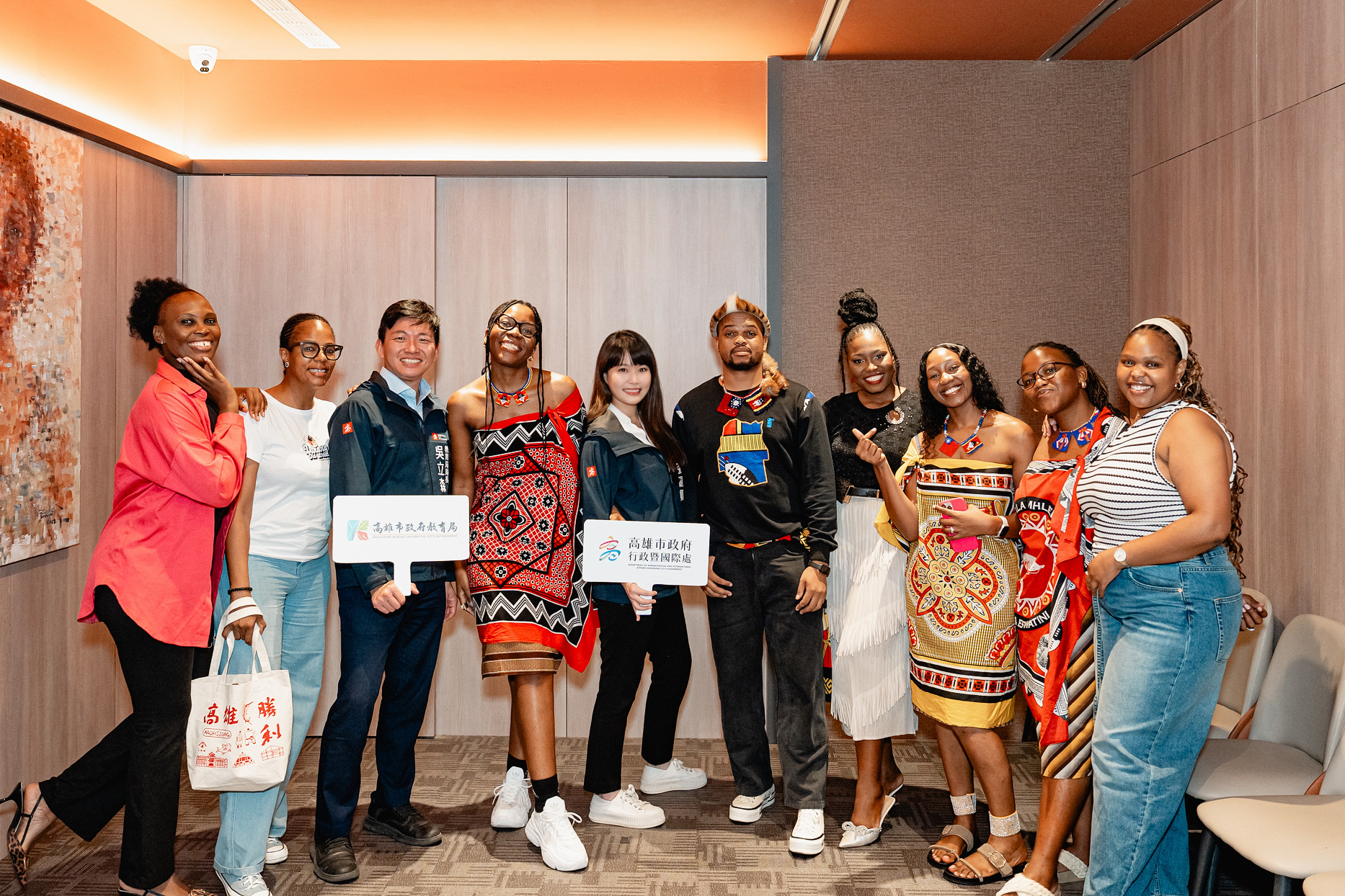 高雄引進來自友邦史瓦帝尼的英語教師邁入第二年,10月28日10位在高雄任教的史瓦帝尼籍青年教師齊聚一堂,與高雄市政府行政暨國際處長張硯卿、教育局長吳立森交流,分享教學心得與生活點滴,現場氣氛熱絡!今年共有10位史國教師於高雄任教,其中9位於去年來到高雄,今年再度主動選擇續留,展現對城市的熱愛與歸屬感。張硯卿與吳立森感謝外師們對高雄雙語教育的貢獻,特別致贈高雄特色大漁旗包與應景的萬聖節果乾禮盒,感謝史國教師對高雄雙語教育與付出,教師們也大秀中文高喊:「我愛高雄!」