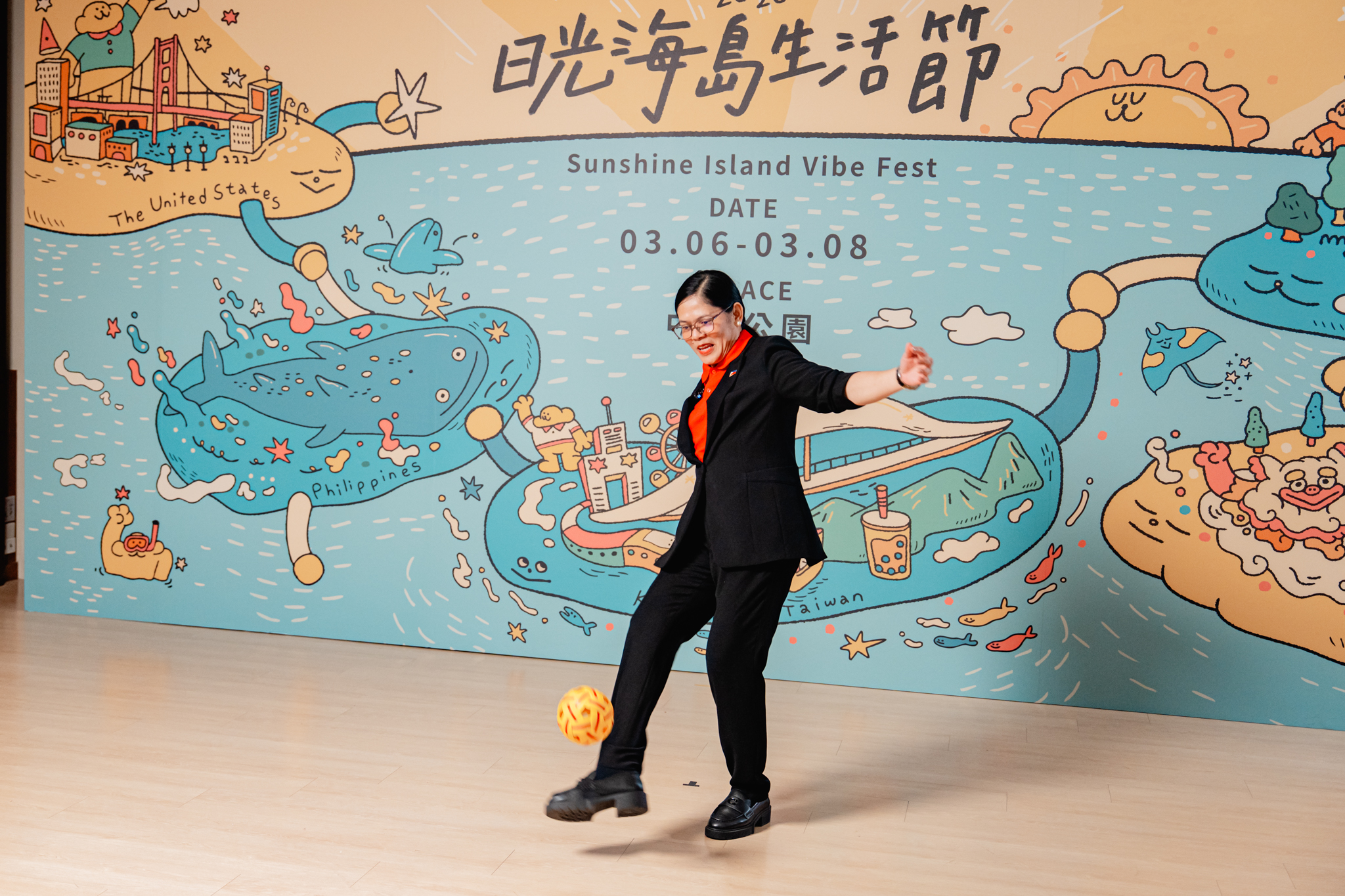 2026日光海島生活節推出更多元的運動體驗,陳其邁與美、日、菲、泰四國駐高代表挑戰藤球運動,邀請民眾一起到現場體驗。「加油!」陳其邁在場邊眾人的加油聲中,比出打氣手勢信心登場,成功回擊多球,氣氛熱烈。日本台灣交流協會高雄事務所所長奧正史(Masafumi Oku)發揮日本「職人精神」,不只盡力以頭部接球,更直接飛撲在地成功救球,隨後精彩回擊,以一記華麗旋身擊球,引來現場陣陣驚呼與熱烈掌聲!美國在台協會高雄分處處長張子霖(Neil H. Gibson)則因一記力道過猛的踢球,藤球差點碰到天花板與攝影機,意外成為全場笑點。馬尼拉經濟文化辦事處高雄分處處長崔瑞霞(Ma. Karina B. Perida-Trayvilla)與泰國貿易經濟辦事處高雄勞工處處長陳燦榮(Nuthchyawach Sanguanchaiyakrit)則自信展現熟練技巧,流暢完成藤球挑戰,獲得滿堂喝彩!
