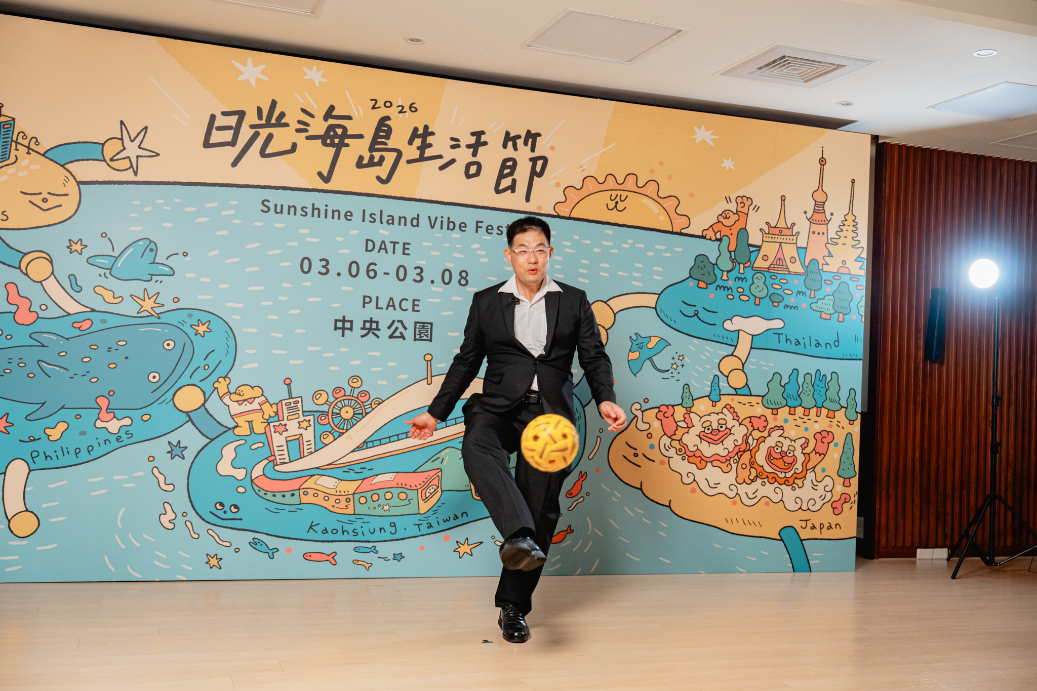 日光海島生活節今年3月6日至8日即將在高雄中央公園盛大回歸,為活動暖身宣傳,高雄市長陳其邁與美國、日本、菲律賓、泰國駐高代表再度合體,挑戰在東南亞十分盛行的「藤球」運動,展現深厚跨國友誼,以及趣味火花!陳其邁與美國、日本、菲律賓、泰國等駐高代表輪番上場挑戰,現場笑聲不斷、氣氛熱絡,五人分別以中文、英文、日文、泰文接力高喊:「2026日光海島生活節,異國美食、多國表演,連續三天、規模升級,趕快把時間留下來!」邀請民眾一同到現場親身體驗多國文化樂趣。