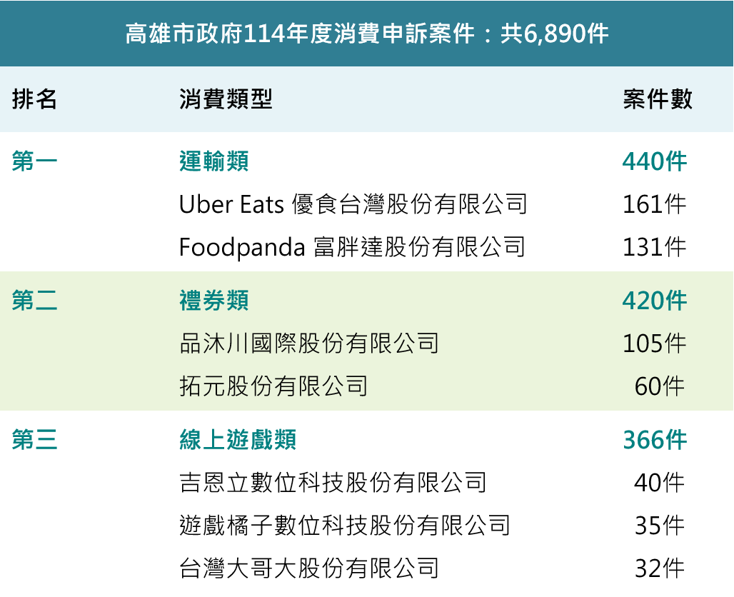 高雄市政府消保官公布114年度高雄市政府受理消費申訴案件統計結果,全年度案件量6,890件,其中消費爭議最多的三大類型,依序為運輸類440件,禮券類420件,線上遊戲類366件。
