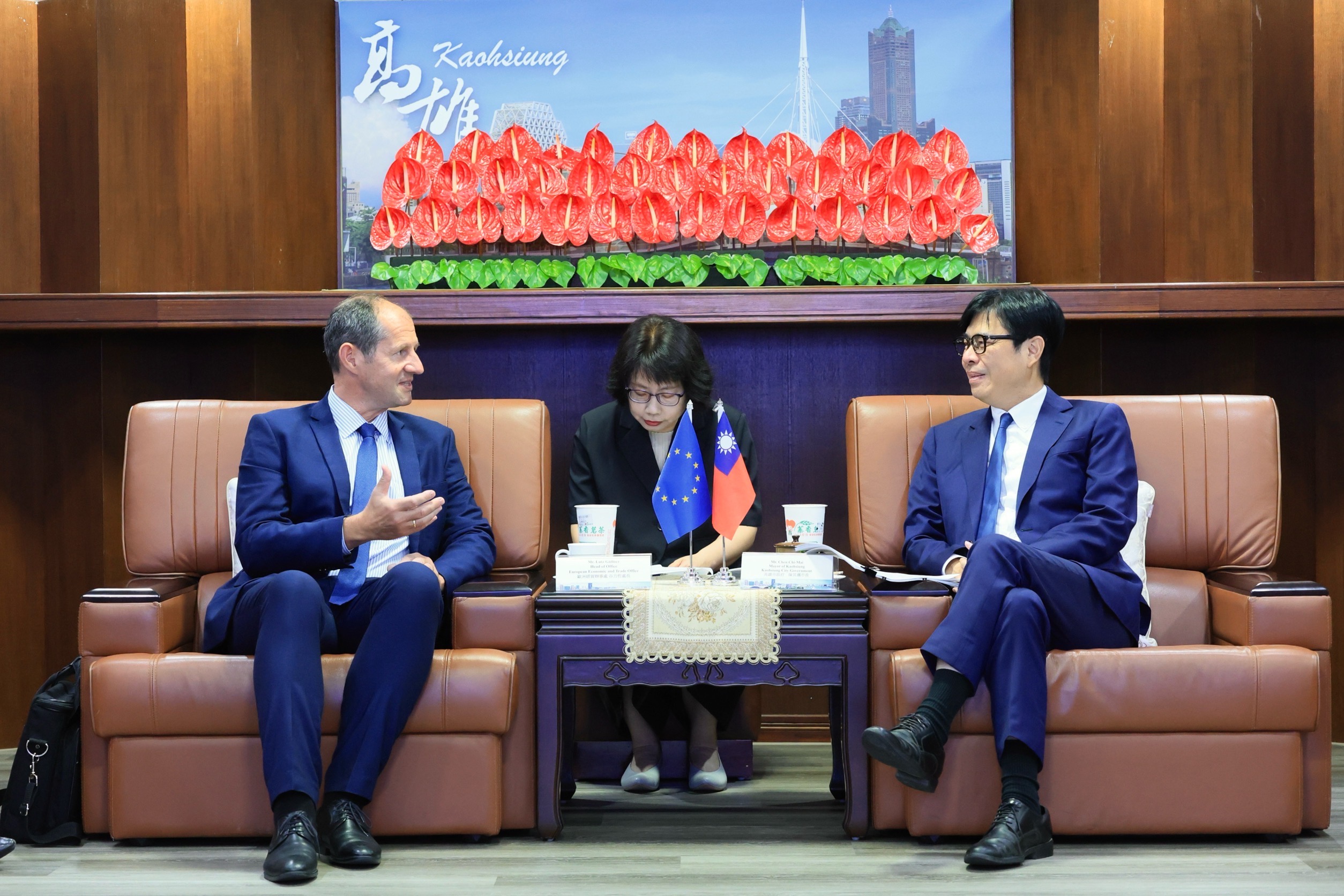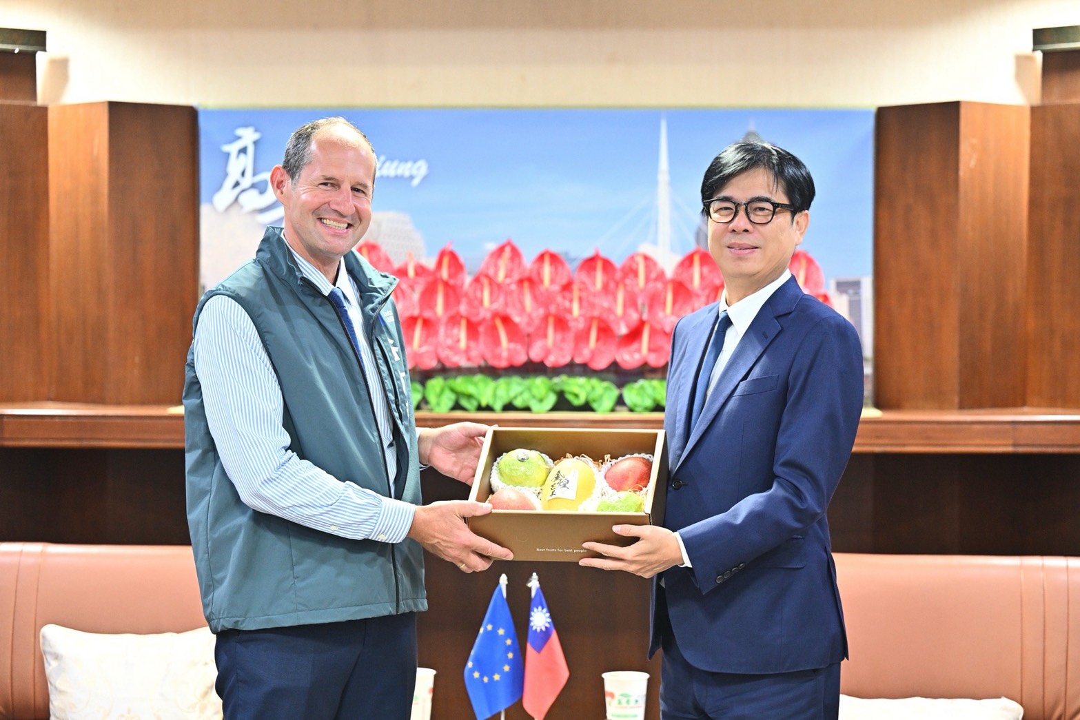 On July 3rd, Lutz Güllner, Head of the European Economic and Trade Office, met with Kaohsiung Mayor Chen Chi-mai. The two sides exchanged in-depth views on the Taiwan-EU relations, sustainable development, and economic and trade cooperation. Kaohsiung was also invited to officially join the EU's International Urban and Regional Cooperation (IURC) program, promising to deepen cooperation with European cities. Taiwan's agricultural exports have recently achieved much success as mangoes and guava received EU approval for import to all EU member states. Mayor Chen specially prepared gift boxes of guavas from Yanchao District, mangoes from Liouguei District, and a fresh fruit platter to share the delicious flavors of Kaohsiung's local agricultural products with Mr. Güllner. Mayor Chen stated that Kaohsiung is honored to participate in the IURC program and will actively share its experience in semiconductor development, smart technology, and net-zero transition, while establishing closer partnerships with European partner cities.