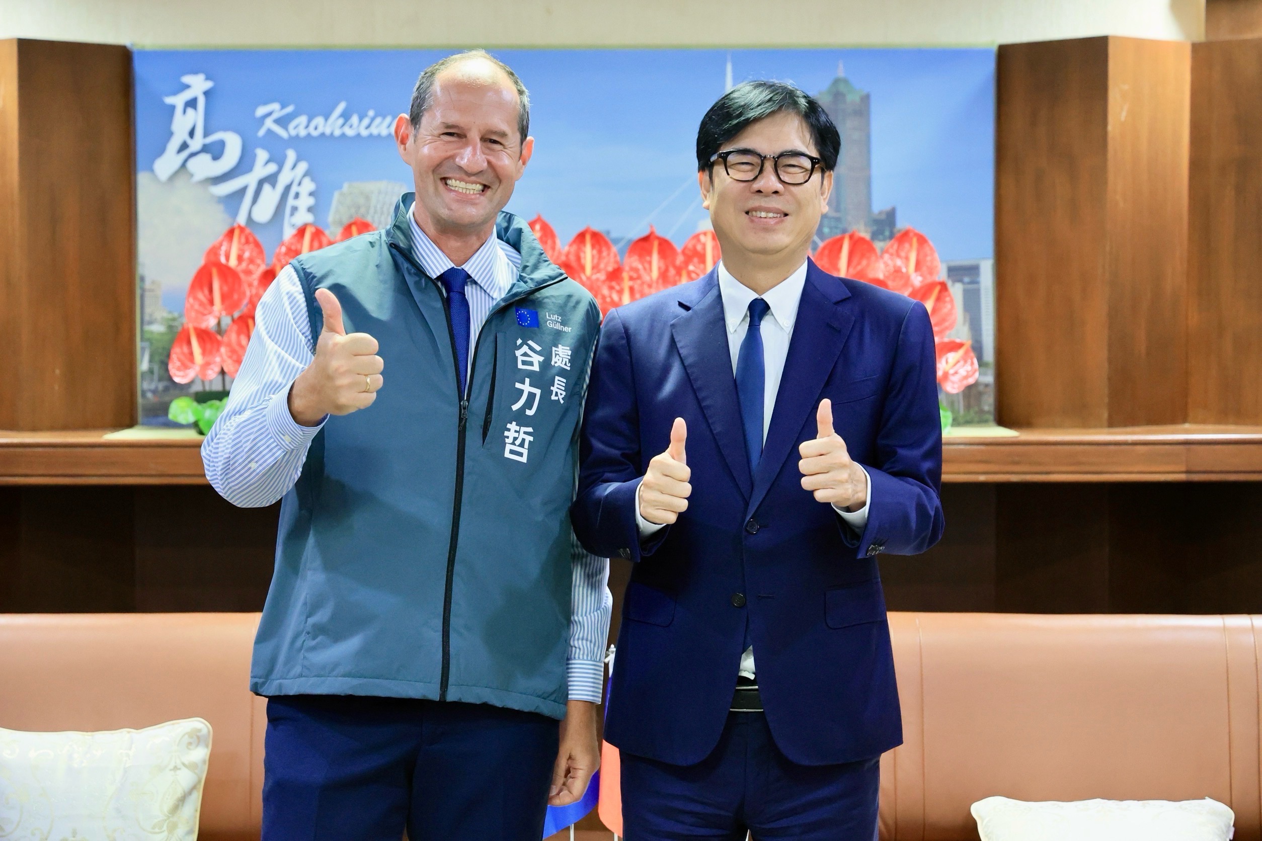 Mayor Chen Chi-mai warmly welcomed Mr. Güllner and presented him with a custom-made Taiwanese vest. Mr. Güllner immediately changed into the vest during the visit, creating a lively atmosphere. Mayor Chen noted that while this was the first official visit between the two, they had met many times during events held in Kaohsiung since Mr. Güllner took office last year. Mr. Güllner recently participated in the Kaohsiung International Dragon Boat Festival in June. Mayor Chen also thanked the European Union for inviting Kaohsiung to participate in the International Urban and Regional Cooperation (IURC). According to Mayor Chen, Taiwan and Europe share core values such as freedom, democracy, and human rights. Kaohsiung has actively promoted urban transformation in recent years. Faced with the challenges of rapid geopolitical change and the restructuring of global supply chains, strengthening cross-border cooperation mechanisms and enhancing supply chain resilience have become more critical.